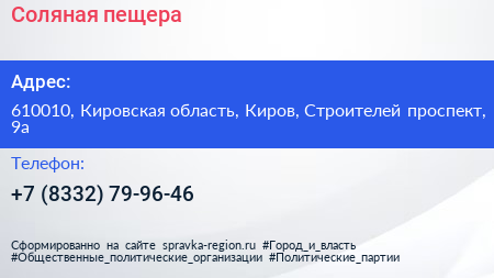 Соляная пещера по адресу 610010, Кировская область, Киров, Строителей проспект, 9а в дальнейшем Организация, размещена в следующих категориях: