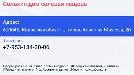Солькин дом, солевая пещера по адресу 610045, Кировская область, Киров, Анжелия Михеева, 20 в дальнейшем Организация, размещена в следующих категориях: