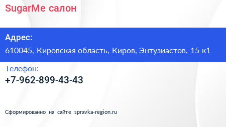 SugarMe, салон по адресу 610045, Кировская область, Киров, Энтузиастов, 15 к1 в дальнейшем Организация, размещена в следующих категориях:
