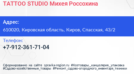 TATTOO-STUDIO Михея Россохина по адресу 610020, Кировская область, Киров, Спасская, 43/2 в дальнейшем Организация, размещена в следующих категориях: