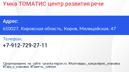 Умка-ТОМАТИС, центр развития речи по адресу 610027, Кировская область, Киров, Милицейская, 47 в дальнейшем Организация, размещена в следующих категориях: