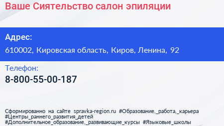 Ваше Сиятельство, салон эпиляции по адресу 610002, Кировская область, Киров, Ленина, 92 в дальнейшем Организация, размещена в следующих категориях: