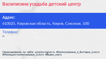 Василисина усадьба, детский центр по адресу 610025, Кировская область, Киров, Союзная, 100 в дальнейшем Организация, размещена в следующих категориях: