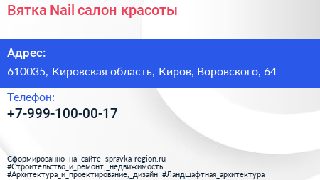 Вятка Nail, салон красоты по адресу 610035, Кировская область, Киров, Воровского, 64 в дальнейшем Организация, размещена в следующих категориях: