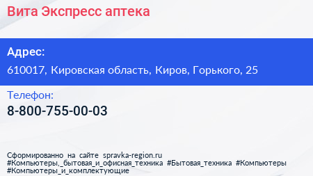 Вита Экспресс, аптека по адресу 610017, Кировская область, Киров, Горького, 25 в дальнейшем Организация, размещена в следующих категориях: