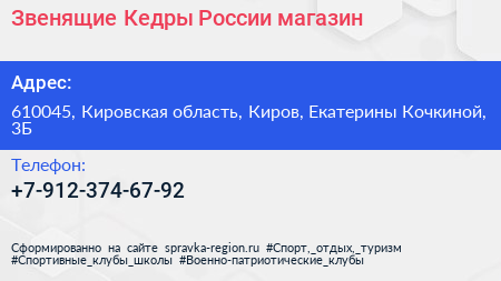 Звенящие Кедры России, магазин по адресу 610045, Кировская область, Киров, Екатерины Кочкиной, 3Б в дальнейшем Организация, размещена в следующих категориях: