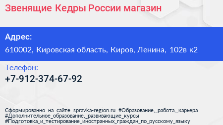 Звенящие Кедры России, магазин по адресу 610002, Кировская область, Киров, Ленина, 102в к2 в дальнейшем Организация, размещена в следующих категориях: