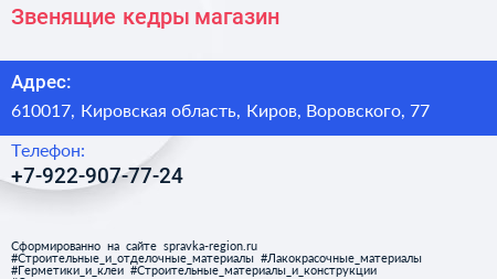 Звенящие кедры, магазин по адресу 610017, Кировская область, Киров, Воровского, 77 в дальнейшем Организация, размещена в следующих категориях: