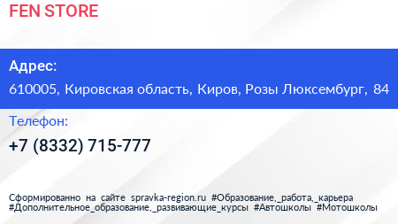 FEN STORE по адресу 610005, Кировская область, Киров, Розы Люксембург, 84 в дальнейшем Организация, размещена в следующих категориях:
