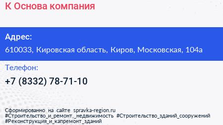 К-Основа, компания по адресу 610033, Кировская область, Киров, Московская, 104а в дальнейшем Организация, размещена в следующих категориях: