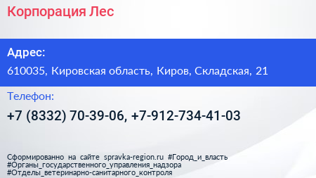Корпорация-Лес по адресу 610035, Кировская область, Киров, Складская, 21 в дальнейшем Организация, размещена в следующих категориях: