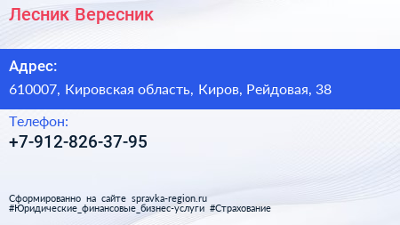 Лесник Вересник по адресу 610007, Кировская область, Киров, Рейдовая, 38 в дальнейшем Организация, размещена в следующих категориях: