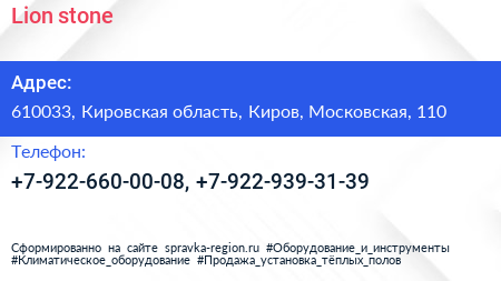 Lion stone по адресу 610033, Кировская область, Киров, Московская, 110 в дальнейшем Организация, размещена в следующих категориях: