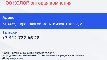 НЭО-КОЛОР, оптовая компания по адресу 610035, Кировская область, Киров, Щорса, 62 в дальнейшем Организация, размещена в следующих категориях: