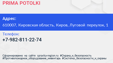 PRIMA POTOLKI по адресу 610007, Кировская область, Киров, Луговой переулок, 1 в дальнейшем Организация, размещена в следующих категориях: