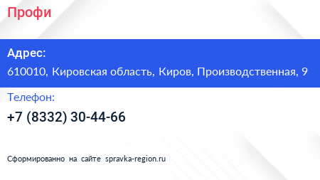 Профи по адресу 610010, Кировская область, Киров, Производственная, 9 в дальнейшем Организация, размещена в следующих категориях: