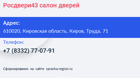 Росдвери43, салон дверей по адресу 610020, Кировская область, Киров, Труда, 71 в дальнейшем Организация, размещена в следующих категориях: