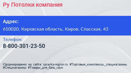 Ру Потолки, компания по адресу 610020, Кировская область, Киров, Спасская, 43 в дальнейшем Организация, размещена в следующих категориях: