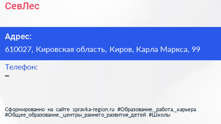 СевЛес по адресу 610027, Кировская область, Киров, Карла Маркса, 99 в дальнейшем Организация, размещена в следующих категориях:
