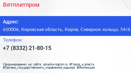 Вятплитпром по адресу 610006, Кировская область, Киров, Северное кольцо, 54/6 в дальнейшем Организация, размещена в следующих категориях: