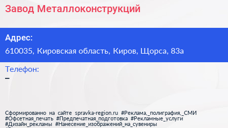Завод Металлоконструкций по адресу 610035, Кировская область, Киров, Щорса, 83а в дальнейшем Организация, размещена в следующих категориях: