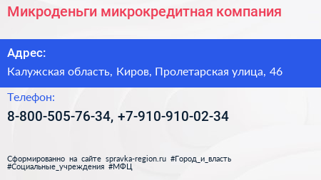 Микроденьги, микрокредитная компания по адресу Калужская область, Киров, Пролетарская улица, 46 в дальнейшем Организация, размещена в следующих категориях: