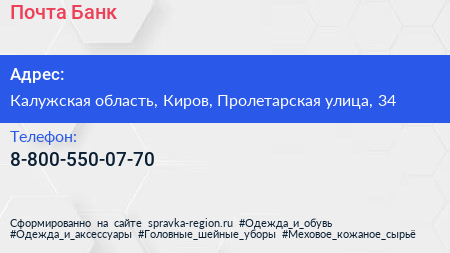 Почта Банк по адресу Калужская область, Киров, Пролетарская улица, 34 в дальнейшем Организация, размещена в следующих категориях: