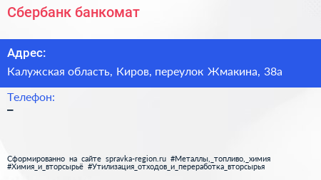 Сбербанк, банкомат по адресу Калужская область, Киров, переулок Жмакина, 38а в дальнейшем Организация, размещена в следующих категориях: