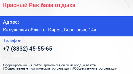Красный Рак, база отдыха по адресу Калужская область, Киров, Береговая, 14а в дальнейшем Организация, размещена в следующих категориях: