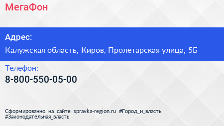 МегаФон по адресу Калужская область, Киров, Пролетарская улица, 5Б в дальнейшем Организация, размещена в следующих категориях: