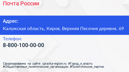 Почта России по адресу Калужская область, Киров, Верхняя Песочня деревня, 69 в дальнейшем Организация, размещена в следующих категориях: