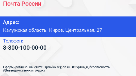 Почта России по адресу Калужская область, Киров, Центральная, 27 в дальнейшем Организация, размещена в следующих категориях: