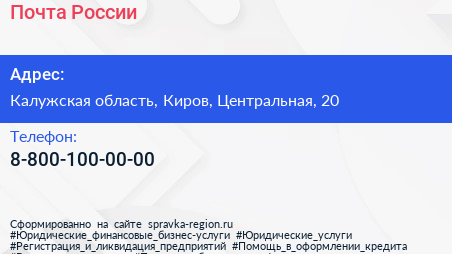 Почта России по адресу Калужская область, Киров, Центральная, 20 в дальнейшем Организация, размещена в следующих категориях: