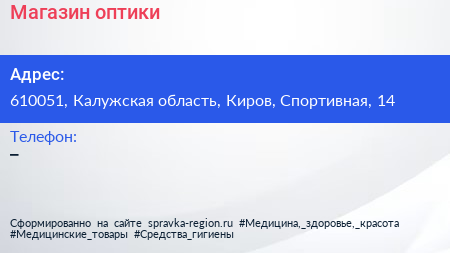 Магазин оптики по адресу 610051, Калужская область, Киров, Спортивная, 14 в дальнейшем Организация, размещена в следующих категориях: