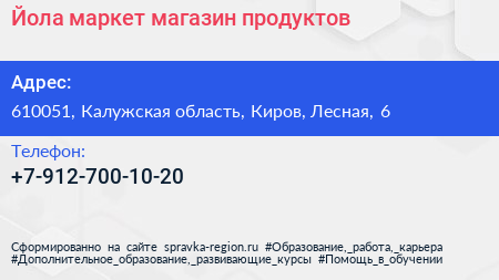 Йола-маркет, магазин продуктов по адресу 610051, Калужская область, Киров, Лесная, 6 в дальнейшем Организация, размещена в следующих категориях: