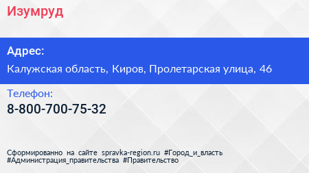 Изумруд по адресу Калужская область, Киров, Пролетарская улица, 46 в дальнейшем Организация, размещена в следующих категориях: