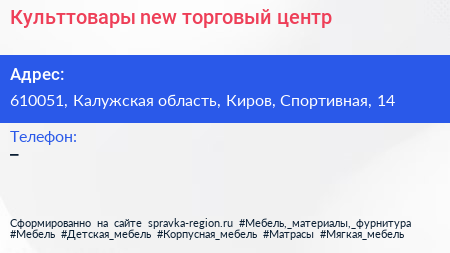 Культтовары new, торговый центр по адресу 610051, Калужская область, Киров, Спортивная, 14 в дальнейшем Организация, размещена в следующих категориях: