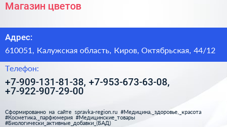 Магазин цветов по адресу 610051, Калужская область, Киров, Октябрьская, 44/12 в дальнейшем Организация, размещена в следующих категориях:
