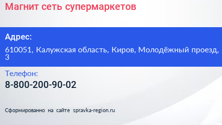 Магнит, сеть супермаркетов по адресу 610051, Калужская область, Киров, Молодёжный проезд, 3 в дальнейшем Организация, размещена в следующих категориях: