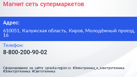 Магнит, сеть супермаркетов по адресу 610051, Калужская область, Киров, Молодёжный проезд, 16 в дальнейшем Организация, размещена в следующих категориях: