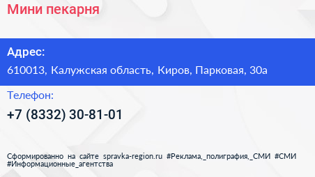 Мини-пекарня по адресу 610013, Калужская область, Киров, Парковая, 30а в дальнейшем Организация, размещена в следующих категориях: