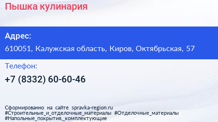 Пышка, кулинария по адресу 610051, Калужская область, Киров, Октябрьская, 57 в дальнейшем Организация, размещена в следующих категориях: