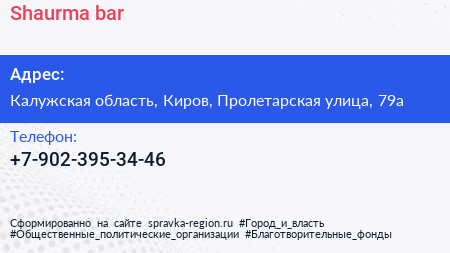 Shaurma bar по адресу Калужская область, Киров, Пролетарская улица, 79а в дальнейшем Организация, размещена в следующих категориях: