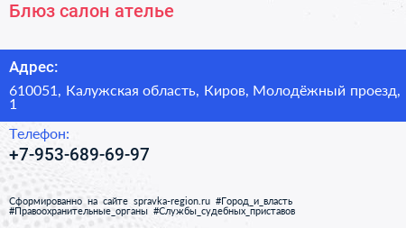 Блюз, салон-ателье по адресу 610051, Калужская область, Киров, Молодёжный проезд, 1 в дальнейшем Организация, размещена в следующих категориях: