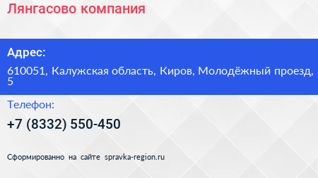 Лянгасово, компания по адресу 610051, Калужская область, Киров, Молодёжный проезд, 5 в дальнейшем Организация, размещена в следующих категориях: