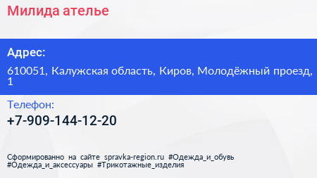 Милида, ателье по адресу 610051, Калужская область, Киров, Молодёжный проезд, 1 в дальнейшем Организация, размещена в следующих категориях: