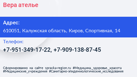 Вера, ателье по адресу 610051, Калужская область, Киров, Спортивная, 14 в дальнейшем Организация, размещена в следующих категориях: