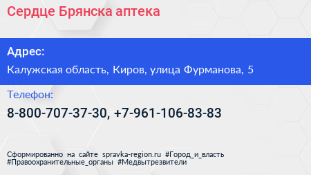 Сердце Брянска, аптека по адресу Калужская область, Киров, улица Фурманова, 5 в дальнейшем Организация, размещена в следующих категориях: