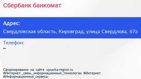 Сбербанк, банкомат по адресу Свердловская область, Кировград, улица Свердлова, 67а в дальнейшем Организация, размещена в следующих категориях: