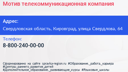 Мотив, телекоммуникационная компания по адресу Свердловская область, Кировград, улица Свердлова, 64 в дальнейшем Организация, размещена в следующих категориях:
